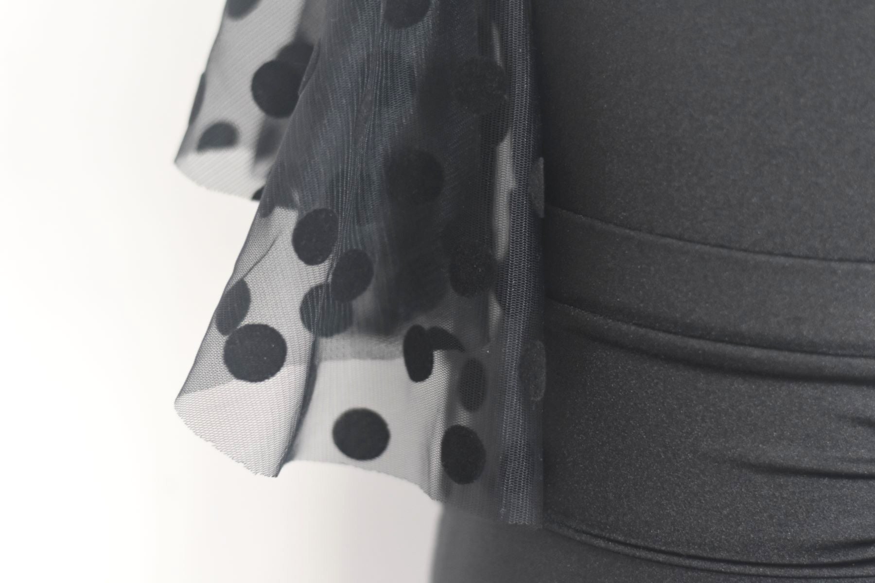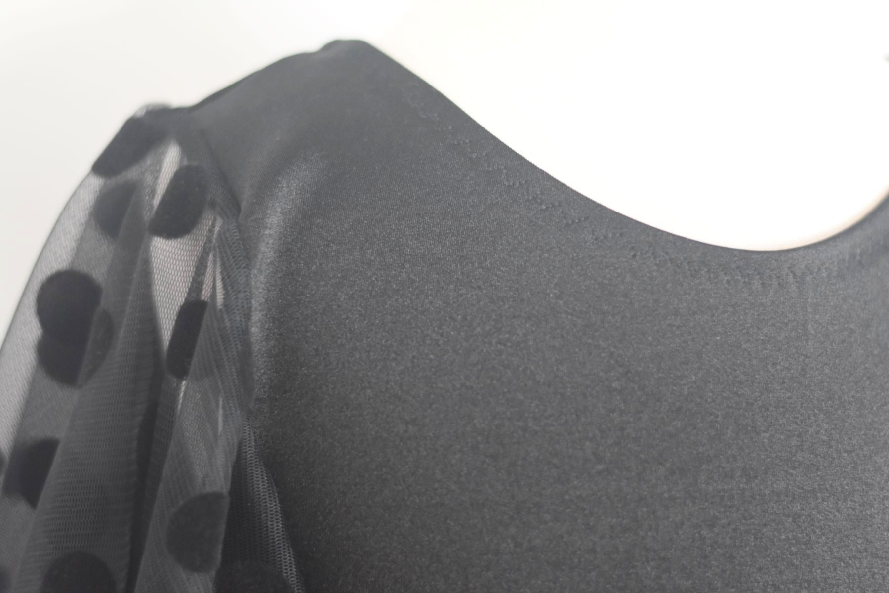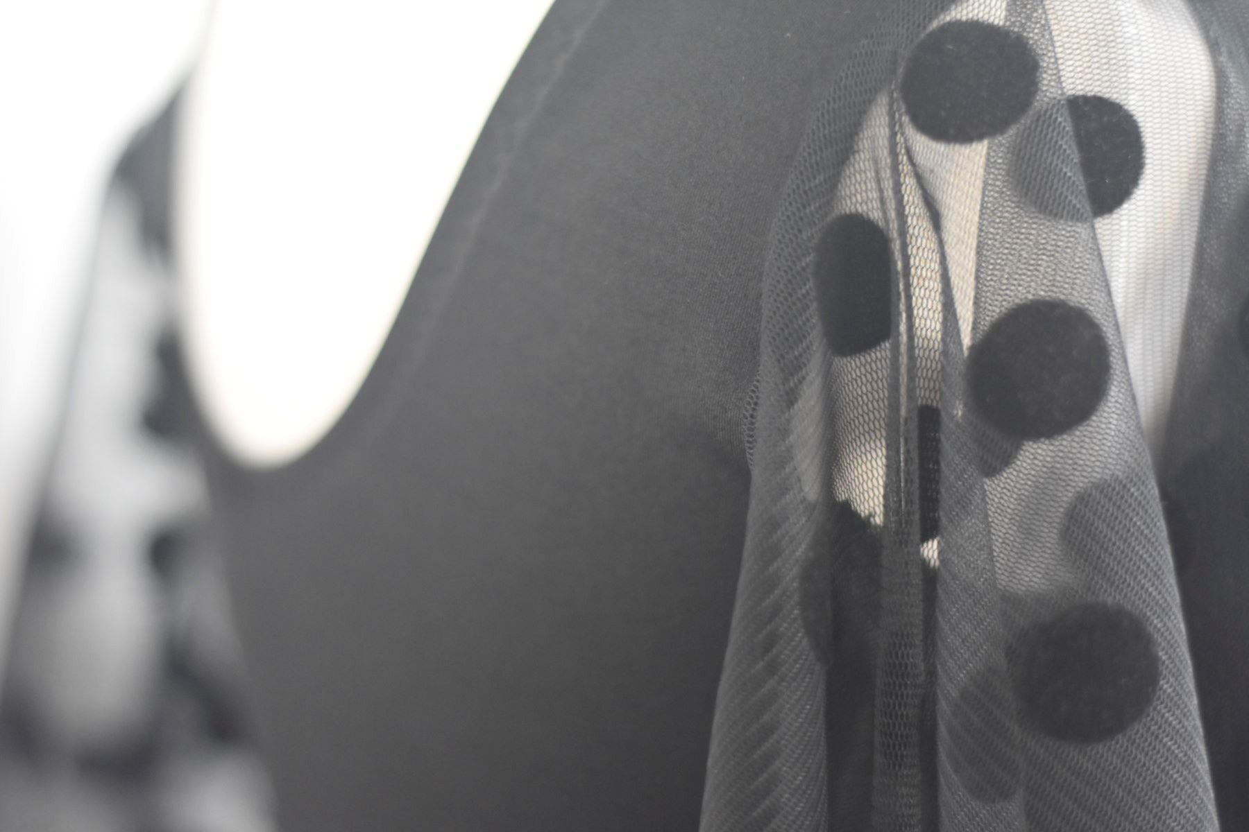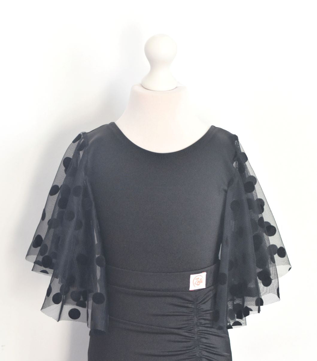 Topul Alix este confectionat din lycra lucioasa cu maneci ample din tulle cu buline de culoare neagra, fiind disponibil in trei variante: